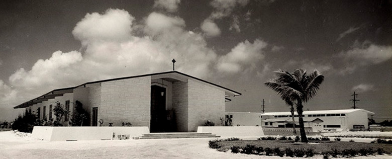 In August 1950, since there was no Catholic Church between Key West and Homestead, 150 miles to the east, Louis Fenton, Charley Toppino and A.E. Woodburn presented Bishop Hurley of St. Augustine a deed to the land on the corner of 50th and 51st Streets, Gulf (now Wendy’s.) Ground was broken in September 1950. A small group of professional and amatuer builders, plumbers and electricians donated their time and expertise to build the Church.
